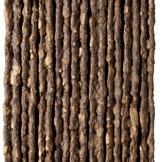 Ingredientes: Raspa de pele conservada de bovino, glicerina, quirera de arroz, farinha de mandioca, farinha de trigo, fécula de mandioca modificada, carbonato de cálcio, sorbato de potássio, propionato de cálcio, pimenta preta (Piper nigrum), aroma bacon.