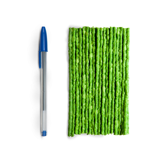 Ingredientes: Raspa de pele conservada de bovino, glicerina, quirera de arroz, farinha de mandioca, farinha de trigo, fécula de mandioca modificada, carbonato de cálcio, sorbato de potássio, propionato de cálcio, pimenta preta (Piper nigrum), aroma de menta.